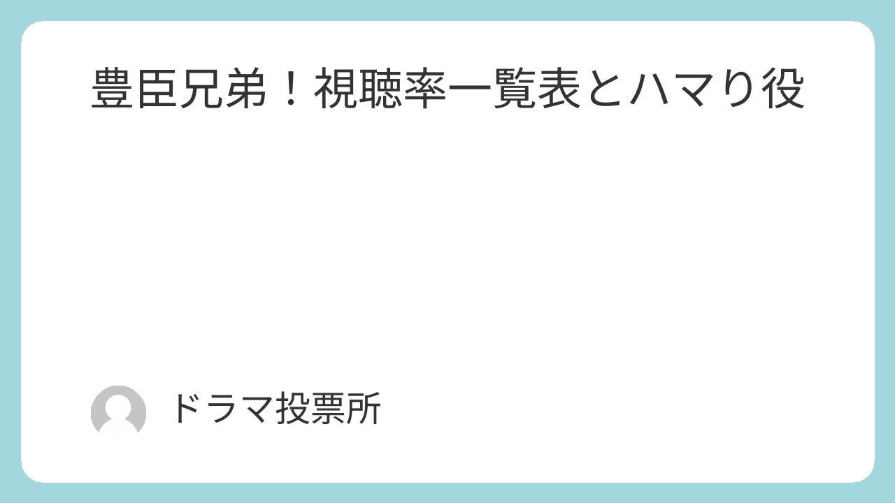 豊臣兄弟!視聴率一覧表とハマり役 X Facebook0 はてブ0 LINE コメント2025.12.29目次豊臣兄弟!視聴率一覧ハマり役の投票所豊臣兄弟!視聴率一覧視聴率サブタイトル放送日%(1)二匹の猿1/4←平均視聴率大河ドラマランキングハマり役の投票所豊臣兄弟!でハマり役は? 小栗 旬 宮﨑 あおい 白石 聖 仲野 太賀 浜辺 美波 坂井 真紀 宮澤 エマ 吉岡 里帆 池松 壮亮 あなたの回答を追加する投票結果を見るPoll Options are limited because JavaScript is disabled in your browser.